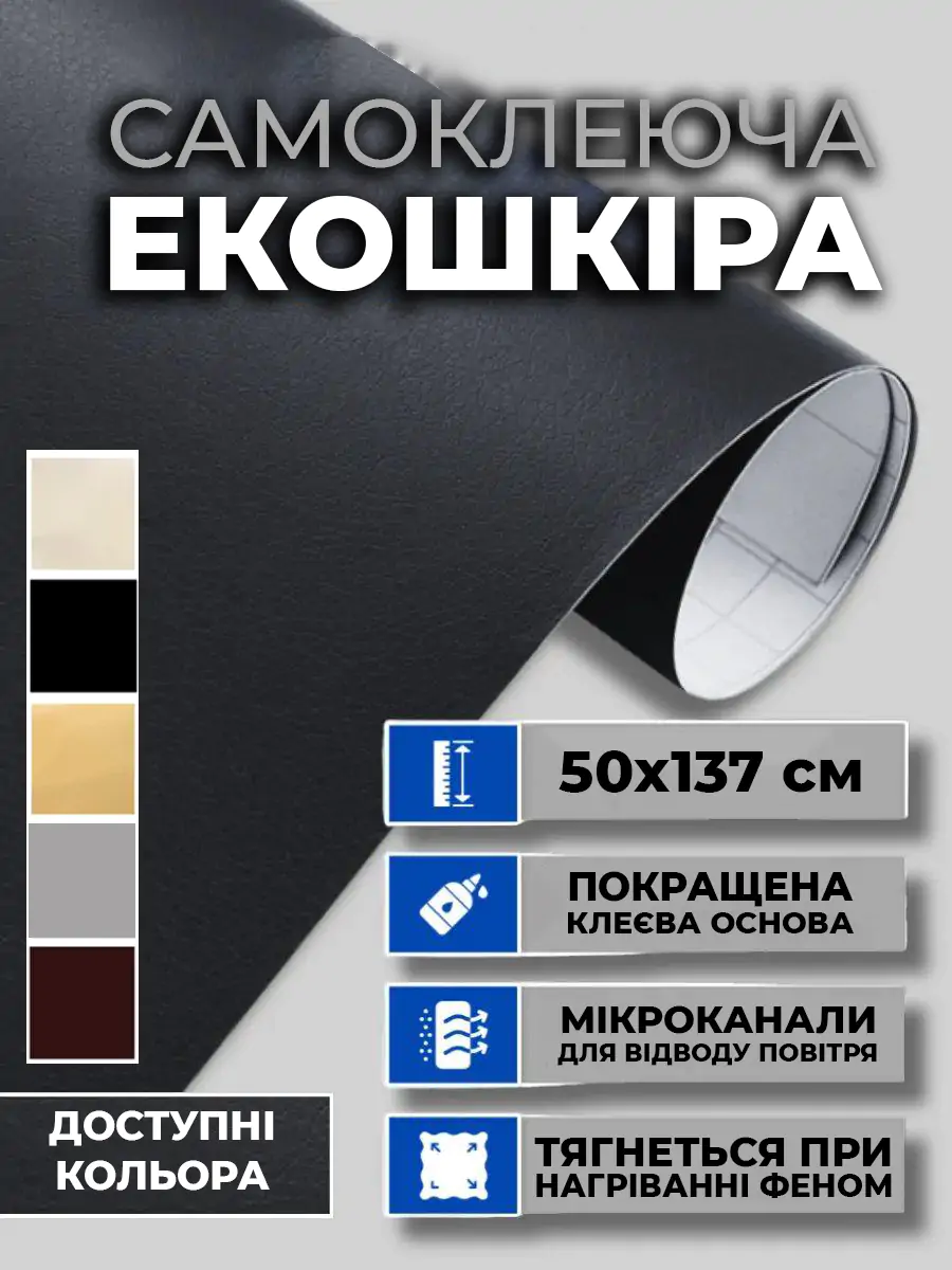 Самоклейна екошкіра у рулоні легко та швидко допоможе усунути усі проблеми з виробами із натуральної шкіри або її аналогів. Самостійно можна відреставрувати меблі чи салон автівки. Матеріал може використовуватися як у вигляді фігурних латок, так і довгими смугами для усунення досить великої площі дефектів.